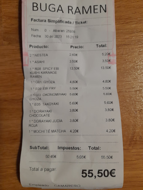 En el restaurante Buga Ramen Zaragoza no soportaremos un desgaste importante en nuestra cartera, osea, es más bien barato, o económicos como más nos guste catalogarlo, pagamos 55,5 euros de tres personas, por lo tanto unos 19 euros por persona, comiendo lo suficiente, como se puede ver en las fotos.