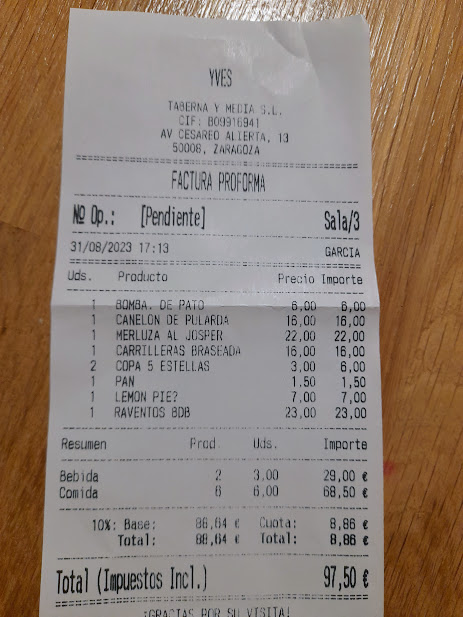 El restaurante Yves Saint Laurent, Zaragoza, no es un sitio barato, pero tampoco caro si valoramos la calidad de sus platos, en el nuevo apartado Nuevos Restaurantes Zaragoza valoré el precio antes de ir en 45 euros por persona. Y no iba mal encaminado aunque subió a 97 par dos por lo tanto a 48,5 por persona, además habiendo tomado un aperitivo y una cerveza inicial.